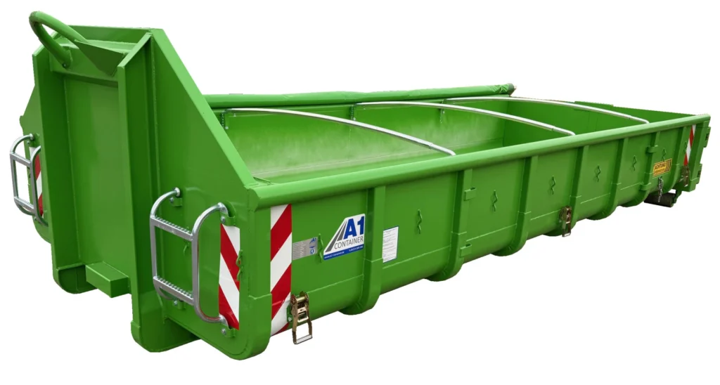 Normbehälter 10 m³ – Rollplane – Doppelflügeltür – RAL 6018 Gelbgrün – Abrollcontainer