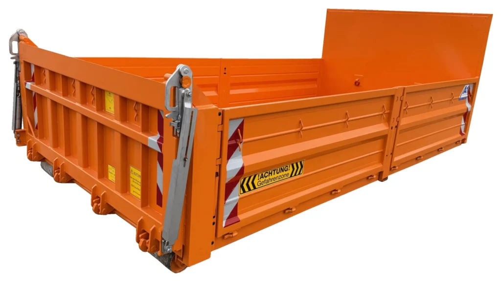 STAHL-Kippaufbau 8 m³ – Bordwände – Pendelklappe abklappbar – 2011 Tieforange – Abrollcontainer